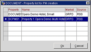 Responding Yes to both prompts creates a new reservation with the status of PM. When the OPP_MHOT Multi-Property PMS add-on license code is active, you can create PM reservations for properties other than your log-in property if you have appropriate permissions in those properties. When catering events that are booked at a different property, the Property list for PM creation screen displays.