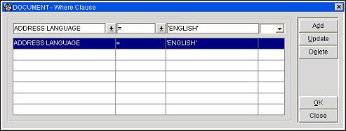 Add. Select to configure a new Where Condition. After entering values in the appropriate fields, select the OK button to save the condition. Multiple Where Conditions can be configured by simply continuing these steps.