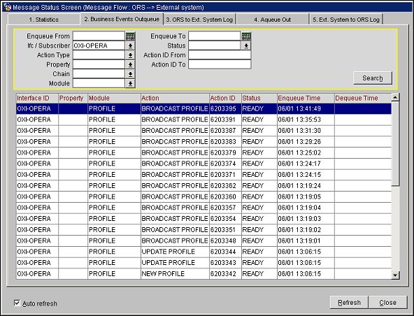 This screen shows all business events and their detailed data elements that have been created in ORS. If the OXI_HUB service is running for a particular interface, the business event will never be visible here, as it will be processed immediately. If business events are created for interfaces that are not running, these will be visible with all their details in this screen.