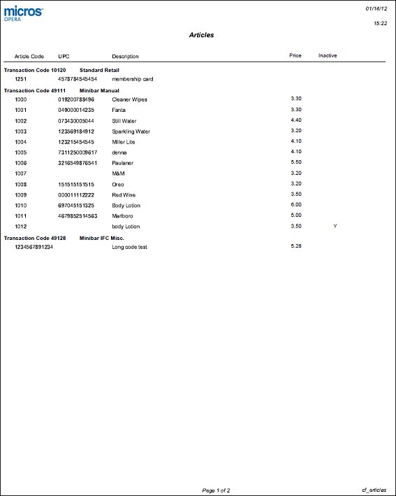 The report will display all configured Articles for your Property. Articles allow a property to post certain items to a guest folio in such a way that they appear to have come from a single transaction code. A typical example would be the items in a minibar. One mini bar transaction code would be configured, however, instead of posting a lump sum to one transaction code you can post the breakdown of that total. Instead of posting 10.00 to mini bar, you can enter 2.00 to Orange Juice, 2.00 to Coca-Cola, 2.50 to Potato Chips and 3.50 to Nuts.
