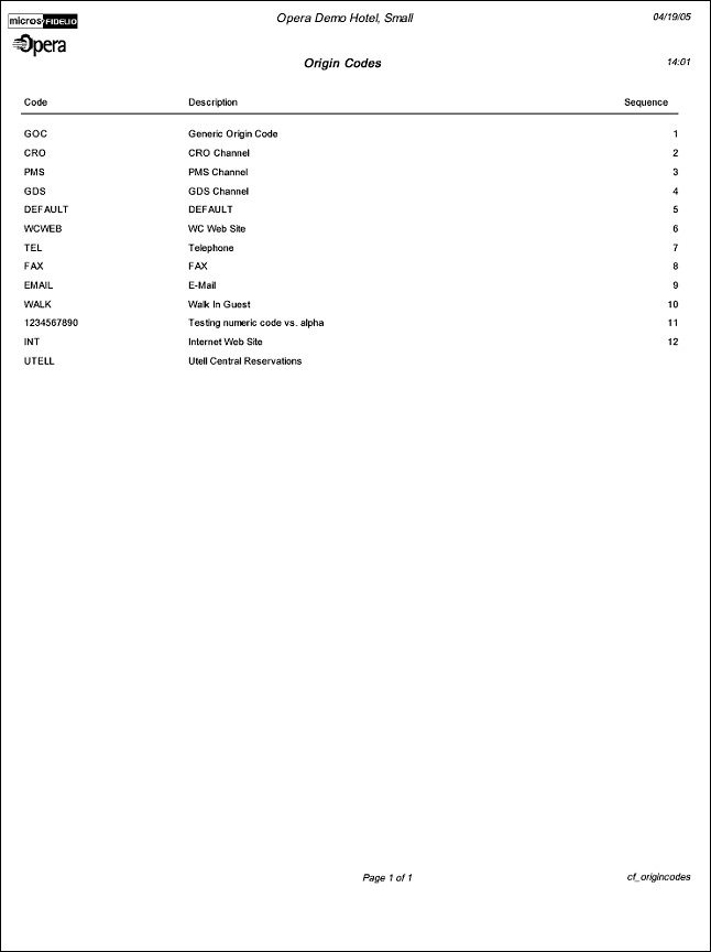 The Configuration report for Origin Codes will display all Origin Codes that have been configured. Origin Codes are not property specific. Origin codes can be assigned to Reservations and on a Block Header.