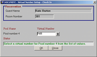 If a guest has permanent virtual number assignments, the check in will be handled the same way as above. For the Auto Assign pool, the system will automatically select and display the permanent virtual number attached to the profile. With the Prompt to Assign pool, the system will display the list of values and position the cursor on the permanent virtual number.