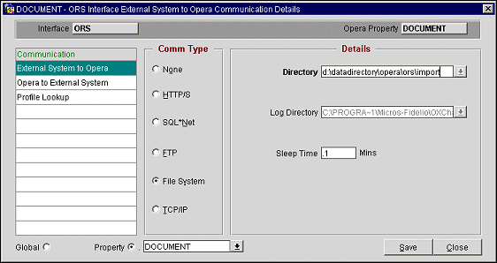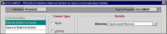 Directory. Depending on the communication data flow selected, this will be the directory for files transmitted from external system to OPERA (import directory), or for files transmitted from OPERA to external system (export directory).