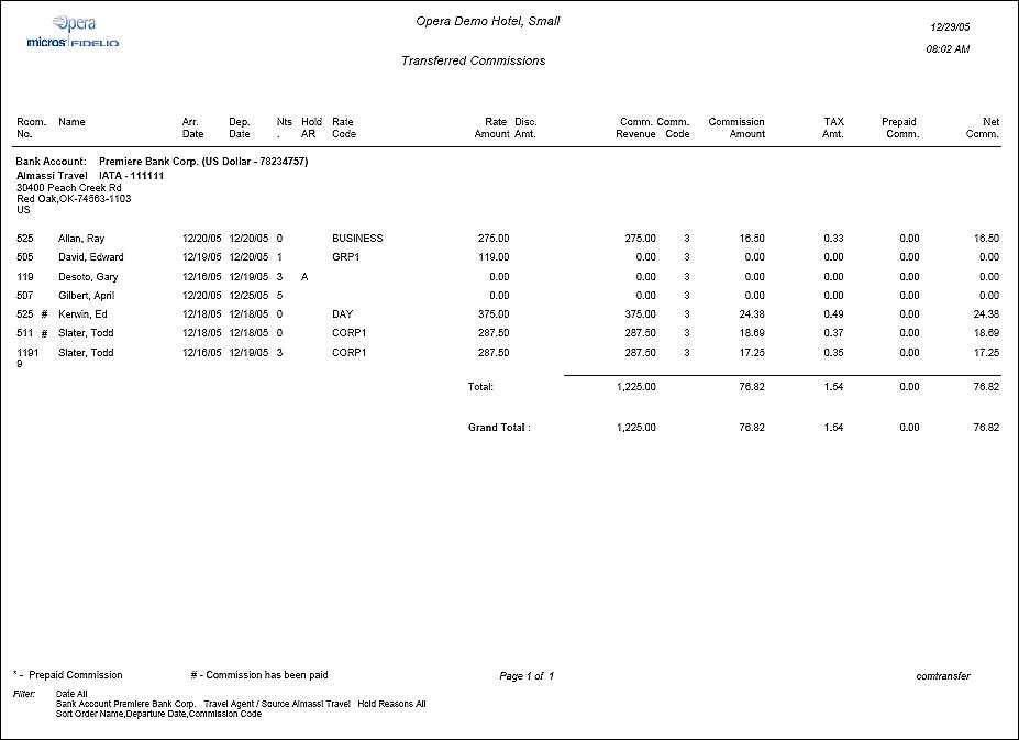 The Transfer Commissions report shows the reservations that are in commission payment processing, by agent or source, for the selected departure date or date range. Each guest record includes commission amount details. The report also shows grand total commissions information for all agents and sources.