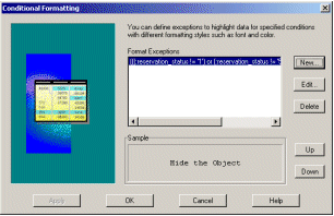 The Conditional Formatting property will allow you to define the formatting for this object based on specific conditions. One of these formatting options is to hide the object completely. Select the … button to activate the Condition Wizard. The Wizard replaces the need to write PL/SQL code to define conditional format triggers.