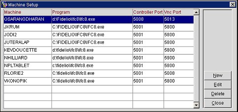 The Machine Setup screen displays a variety of information about the Interface PC, including the machine name, the program installed on the machine (IFC7 or IFC8), the controller port, and the VNC port. To configure a new machine, select the New button. To edit an existing machine configuration, select the Edit button. Select the Delete button to delete an existing configuration.