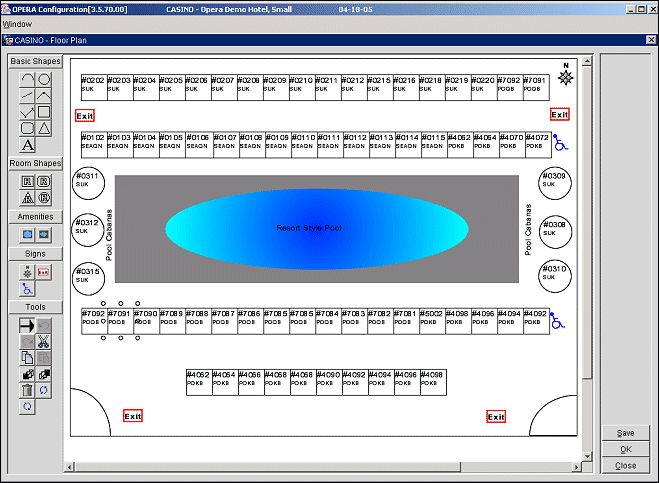 Select Configuration>Reservations>Floor Plans to design the floor plans that are available from the [Shift+F5] Quick Key and from Reservations>Floor Plan menu bar option. (See Floor Plan for details.)