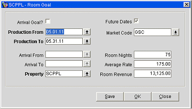 Production From/Production To. If the Arrival Goal Y/N check box is not selected, this is a production goal. Production goals are booking goals, regardless of the arrival date. For example, if the Production From / Production To dates are January 1, 2006 and March 31, 2006, any booking made between January 1 and March 31 on a certain "credit" status, or changed during this time frame to the defined "credit" status, would be counted toward meeting the goal. Select the down arrow to see a list of the production periods set up for the property. (Production periods are set up using System Configuration > Cashiering > Period Definition.) Selecting the production period automatically sets both the Production From and Production To dates.