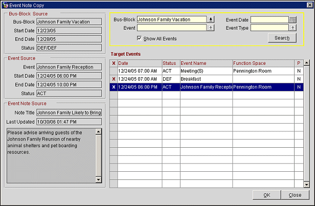 Highlight an event note on the Event Notes screen and select the Copy button to copy the note to other events. The Event Note Copy screen appears.