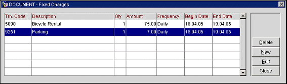 Note: When you select the Fixed Charges button and there are existing fixed charges attached to the reservation (or to the AR account when working with AR fixed charges), the Fixed Charges screen displays. Otherwise, the Fixed Charges - New screen appears.