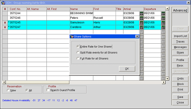 When the All option button is selected on the Group rooming List, all reservations belonging to the block are displayed. You can set up shares by marking an X in the X column and selecting the Save button.