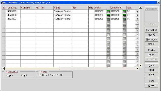 The Group Rooming List screen has two views — New and All, which are controlled by the New and All option buttons. New is used for creating new reservations for the booking by either splitting the posting master or by creating new individual reservations. You can also create shares while you are making new reservations for the booking. All allows you to see all reservations that have been made for the booking.