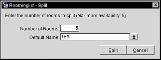 Note: The number OPERA displays for the maximum number of rooms to split (maximum availability) depends on the reservation highlighted by the cursor. If you have positioned the cursor on the group master reservation, the number of rooms displayed will reflect the size of the group (or the block). If you start the split from a group member's reservation, OPERA will warn you that you are not on the group master record and ask whether you want to continue. When you select Yes the maximum number of rooms to split is the actual Number of Rooms on the group member reservation minus one. Therefore, if the reservation is for only one room, you cannot split off any rooms and an appropriate warning message will be displayed.