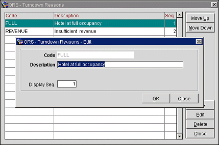 To add a new turndown reason, select the New button from the Turndown Reasons screen. To modify an existing turndown reason, highlight your choice and select the Edit button. The Turndown Reason - New or Turndown Reason - Edit screen appears. Provide the following information and select the OK button.