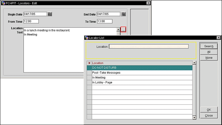 The Locators screen is used to inform hotel personnel, particularly Front Desk staff and telephone operators, of the guest's on-premises location if the guest wants to be contacted for phone calls or other reasons while away from their room. A locator can even be placed on a guest who has checked out, but only for the check-out date of the guest. This feature can, for example, be used when guests request that their phone calls be temporarily transferred to an alternate location, such as the spa or dining room. (Locator functionality is available when the Front Desk>Locators application parameter is set to Y.)