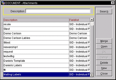 This screen lists a description of your existing Word templates (which are a type of "attachment" in OPERA), along with the field list used by each. (The field list is a set of fields that have been selected from among the fields available from a data source used in your data extraction query.) Click in the Fieldlist column to see the name of the template doc file, the file size, and the date when it was created or last modified.