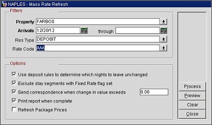 The Mass Rate Refresh screen provides a means to select a given set of reservations for rate updates based on criteria such as property, arrival and stay dates, reservation type, and rate code. Users have options for using deposit rules to determine which nights the rates should be left unchanged, define which stay segments will be excluded, send correspondence to a customer when the rates change, and print a report of the rate changes.