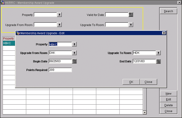 The Membership Award Upgrade screen appears after the Details button was selected from the Membership Awards screen. This screen shows the upgrade-based membership awards for the current membership type. Use the search criteria to filter the list by property, from and to room type, and/or by valid from date.