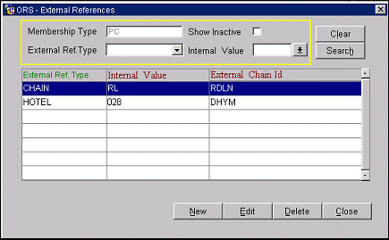 Membership programs can each have their own codes for identifying a property, a chain, a location, or an IATA city. For this reason, it is necessary for you to specify conversion values that will be used during the export process for each membership type. Select the Reference button from the Membership Types screen (System Configuration> Profiles>Memberships>Types) to display the External References screen. This screen enables you to configure "mapping" values so that export files will be created with external codes.