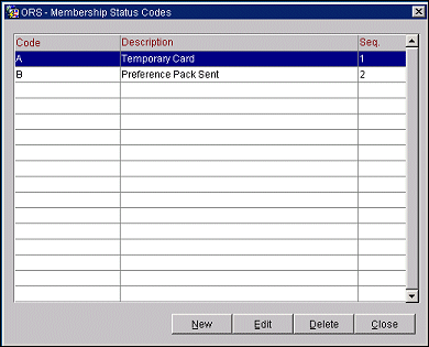 Membership status codes may be assigned to individual memberships to define the current "standing" of the membership. For example, a membership might be characterized as PERM (permanent card mailed), REJ (does not want to join), PREF (preferences need to be selected), and so on, for whatever purposes your organization might have. A membership status can be assigned to a membership on the ORS Memberships screen (select Memberships from the Profile screen Options menu). The membership status code can then be downloaded to the properties to keep them informed of the current status of membership enrollments.