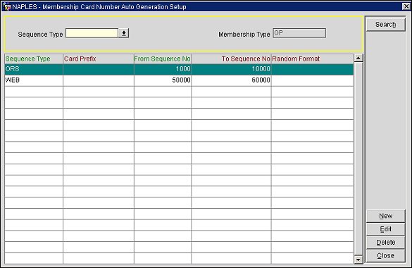 From the Membership Types screen, select the Sequence button to open the Membership Card Number Auto Generation Setup screen.