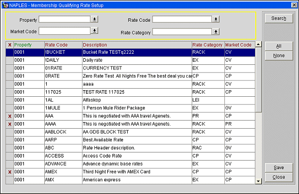 The Qualifying Rates form allows you to select or clear the membership check box for multiple rate codes. This screen is useful because several rate codes can be changed in this one screen. If you don't use this screen, the Membership check box must be selected or cleared manually in the Rate Setup window for each rate code.