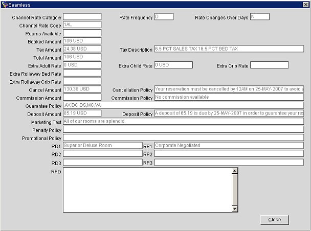 The Seamless screen, accessed by selecting the Seamless button on the Channel Rate Parity screen, provides a detailed view of a specific channel room/rate configuration as it will be displayed to the channel. When you have finished reviewing the channel rate/room configuration, select the Close button.
