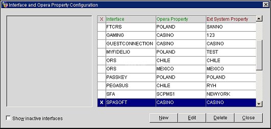 To set up the SpaSoft interface in OXI, Log into OXI and select "Switch Interface" from the main menu. The Interface and Opera Property Configuration screen appears, displaying all of the available interfaces per property. Select the New button. The New Interface Setup screen appears.