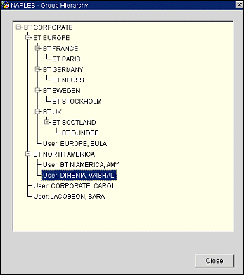 Hierarchy. Displays the entire Group Hierarchy screen where you can view the group hierarchy and relationship of the highlighted user.