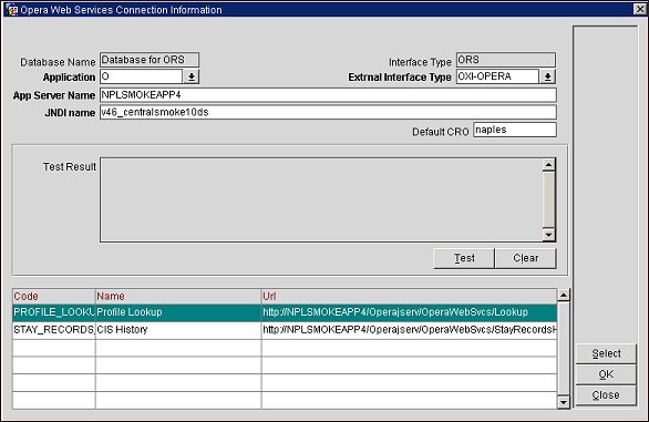Setup OPERA Web Services in the remote property (Configuration > Setup > External Databases) by selecting the Webservice button at the bottom of the External Databases screen. The Web Services Connection Information screen opens. On the Web Services Connection Information screen, verify that the App Server Name and JNDI Name fields are populated with the correct values for the external database with which the interface is to be configured. Select the Test button to verify the connection setup is completed correctly. A message will indicate the status of the test in the Test Result pane.
