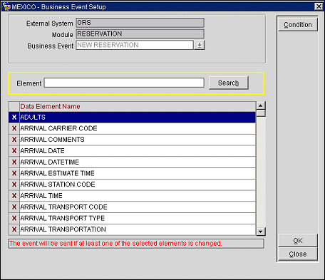 Selection of the Data Element Name is done by clicking in the X column to the left of the data element. Example: When a Data Element Name is selected here and an action is carried out in ORS that involves that data element, a business event is generated, which then becomes a message to the external system.