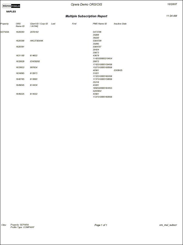 The Multiple Subscription report identifies the profiles which have multiple subscriptions, such as one ACTIVE and one INACTIVE for the same property. This gives the PMS users the information to perform the merge properly on PMS and ultimately delete the INACTIVE subscription in ORS.