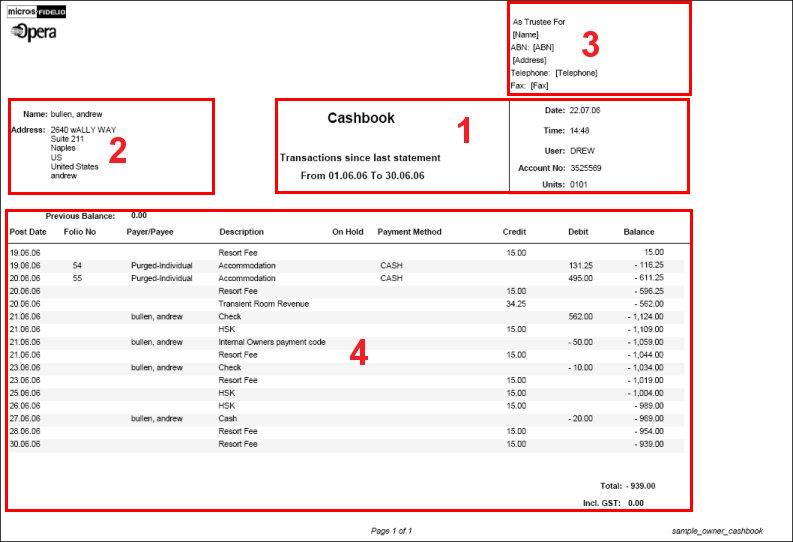 Owner Cashbook statements, available when the Owner Cashbook Ownership Group Application Parameter is set to Y and the Ownership>Revenue Pooling application function is set to N, display disbursements, payments, and owner account balances in a format that facilitates an internal audit by State Auditors.