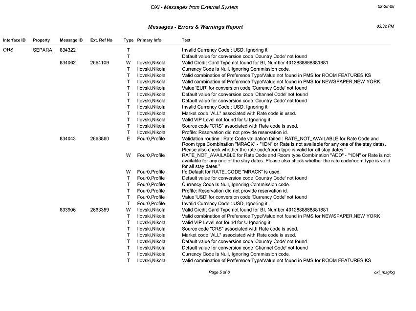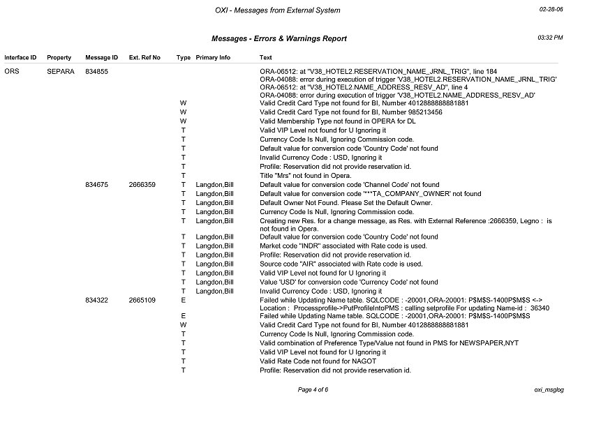 This report captures error messages and warnings for a particular interface/property based on the selection criteria used on the OXI Message Status screen. This report (shown below as Messages from an External System) contains the following data, by column: