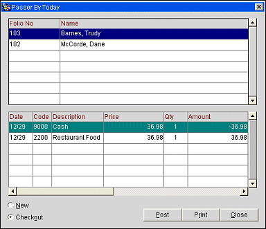 Checkout. Select the Checkout option button to see the passer by folios that have been created for current business date, or to post another transaction for a passer by who has already initiated a folio today. When this option button is selected the top grid displays a list of all today's passer by folios. Highlight a passer by on the top grid to see the details of the transaction in the lower grid. To make another passer by transaction, highlight the name of the passer by for whom the transaction is to be posted and select the Post button. You are taken directly to the Transaction Posting screen, without searching for a profile.