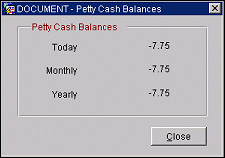 To check the balance in a petty cash account, highlight the account on the Petty Cash screen and select the Balance button. The Petty Cash Balances screen appears.