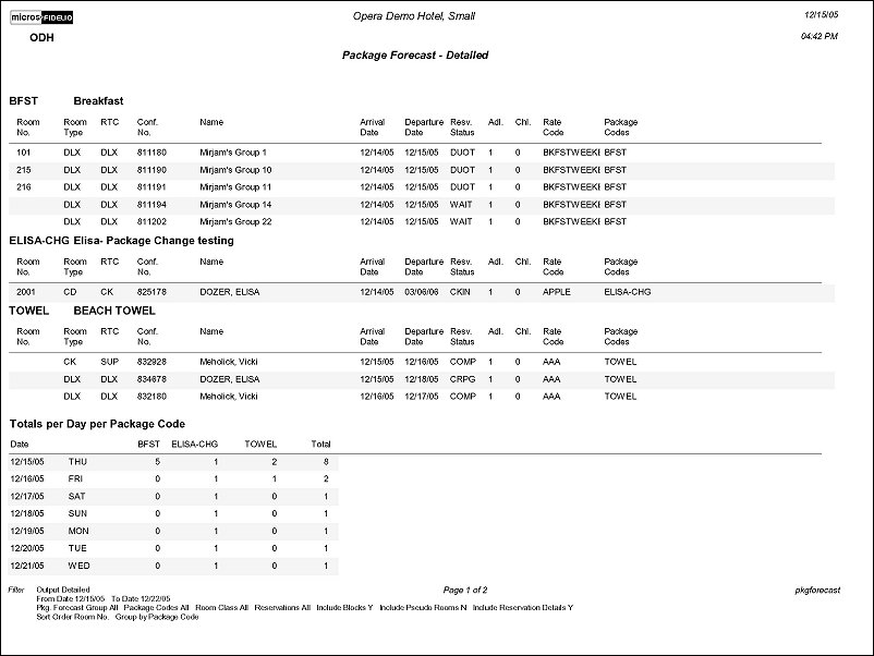 Package Forecast Group. Type a comma separated list or use the multi select LOV for filtering on specific Package Forecast Groups. Only include Reservations that have Package Code(s) that are attached to the selected Package Forecast Group, on a Reservation/Block.