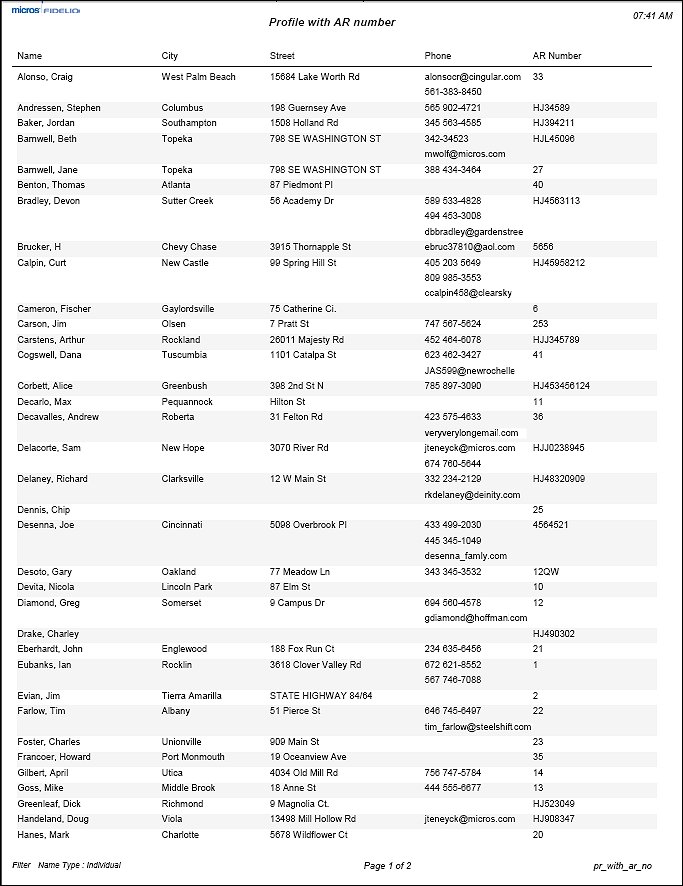 For each profile, the report shows the profile name followed by the primary mailing address (City and Street). The Phone column shows the primary phone-type communication address (such as a mobile phone number, home phone number or business phone number) configured for the profile; if no phone number is configured for the profile, a primary communication address of another type (e.g., FAX, EMAIL, WEBPAGE), as available, will appear in the Phone column. If the profile has multiple communication addresses designated as primary for their type (e.g., FAX, EMAIL, WEBPAGE), these are listed in the Phone column on separate lines, without repeating the profile name, street address, and AR number. The AR Number column shows the AR account number.