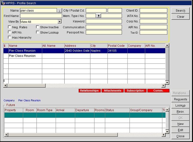 Note: A Future Grid, showing a guest's future reservations, appears below the search results grid opens and displays future reservations for all profile types (Individual, Company, Travel Agent, Group, Source and Contact) as well as the default View By value of View All when the PROFILES > SHOW FUTURE RESERVATIONS Application Parameter is set to Y.