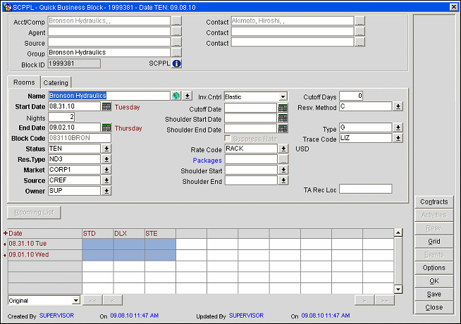 The Rooms grid section displays the Original (non-deduct) availability, Contract availability and Rates, depending on your selection from the pick box. Select the Range button to specify room types, number of nights and occupancy to evaluate options for the booking.