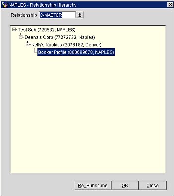 The Hierarchy button, when selected, displays the current profile’s hierarchical position in a tree view style diagram. If another account is selected from the diagram, then the user is returned to the Account Relationships screen refreshed with the selected account as the current profile. Hierarchical relationships allow you to build multi-level relationships such as master>sub1>sub2 and so on. (Non-hierarchical relationships support only one level, for example, Employer or Employee; non-hierarchical relationships are used mainly on individual profiles.) The Hierarchy button is only available on screens when the highlighted profile has at least one hierarchical relationship configured.