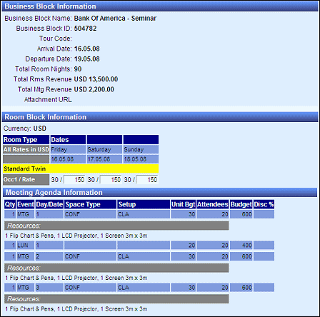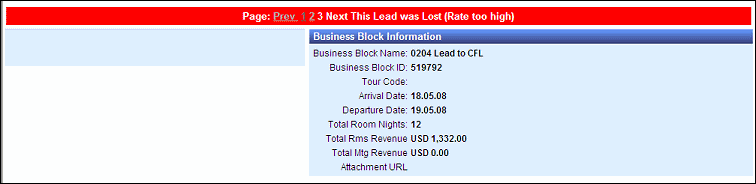 Room Block Information. Detailed room grid for the business block if this has been created on the SFA system. If no room grid is attached to the booking, this section will not appear. Note the ability to update the rates directly from the Web Lead Reply screen in the Room Block Information section. If any changes are made to the rates from here, they are updated and sent back to SFA.