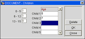 Note: If the RATES > RATES BY DEFINED BUCKETS application function is set to Y, and child age buckets have been set up using the RATES > MIN AGE RATE BUCKET and MAX AGE RATE BUCKET application settings, an ellipsis button appears next to the Child field. Select this button to view or edit the number of children in each age group (e.g., 1-12 Years, 13-15 Years, 16-18 Years). Enter the age of the first child in the Child 1 Age field, enter the age of the second child in the Child 2 Age field, and so on. When you are done, select the OK button and the number of children in each age group will appear in the fields to the left.