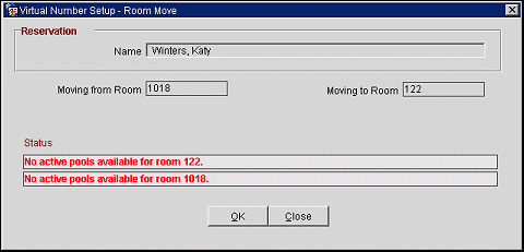 Virtual Numbers: If your property uses virtual extension numbers, a room move will check whether virtual number pools are available for the target room and assist with setting up the virtual numbers in the new room. If the guest being moved has virtual numbers permanently assigned to their profile, the move will ensure that these numbers are available to the guest in the target room.