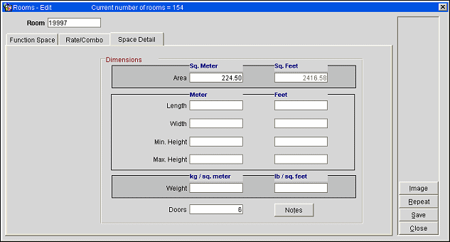 The Space Detail tab on the Rooms - New or Rooms - Edit screen is used to provide physical measurements of those rooms that are employed primarily as meeting spaces and for catering events.