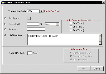 - Log in to the OPERA application. Locate the transaction code where the UDF function will be running. Select the Generates button and add the transaction code where the tax calculation will be posted, and select the UDF Function option button.