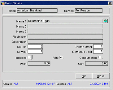 Consumption. Select this check box if this menu item is based on consumption. Selecting this option enables the entry of a quantity used for forecasting. Included is not available if this option is selected. On the BEO, an item marked as Consumption will print price and container — not quantity.
