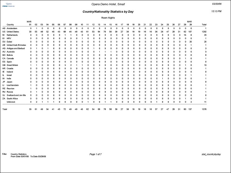 The Nationality/Country Statistics by Day Report generates both nationality and country statistics per day. The statistics output can include Room Nights, Persons, Adults, or Children. The report can also display the breakdown of the tax statistics per day if the Application Parameter TAX_FREE_GUEST has been activated.