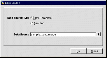 Data. Use the Data button to select the data source for your Oracle BI Publisher report. When the Data button is selected, the Data Source selection screen displays. From this screen there are two available options, the data source type and the data source name. The option buttons and the data source file name are automatically defaulted here. This is true based on the report group you are adding the report from (e.g., Folios, Confirmation Letter, etc. ).