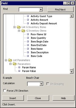 Select the XML tag or field to add to the customizable report from the list of available fields. The Tree of available fields is divided into the sections that they are applicable to on the report, (e.g., header, footer, body, etc.). You can add fields by highlighting and dragging to the document or double clicking on a selected field from this list.